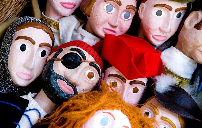 Es gibt riesige und winzige Puppen, alte und moderne, professionelle und Spielzeugpuppen, auch kleine Theater und Scherenschnitte, Poster, Postkarten, Briefmarken, Bücher, Streichhölzer, Untersetzer, Spielkarten, Karten, Aufkleber, Anstecker...