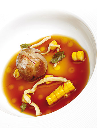 Aus 2 l entfetteter Hühnerbrühe und 4 Eiweiß eine geklärte Hühnerbrühe (Consommé) zubereiten. Nudeln hinzufügen. Das marinierte Eigelb zu Blättern formen und zum Anrichten verwenden.