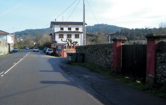 Der Weg mündet in die Santurio-Straße, der wir einige Meter folgen, bevor wir sie überqueren und zu dem Landgut gelangen, in dem sich die Kapelle Nuestra Señora de la Corrada (16. Jahrhundert, möglicherweise mittelalterlichen Ursprungs) befindet, die zum Stammsitz der Familie Cifuentes gehörte. Der Weg führt weiter am Ufer der Peñafrancia entlang, wo wir das mit Wappen versehene Haus der Familie García Jove (17. Jh.) mit einer Kapelle und einem Brotkorb vorfinden, bevor wir durch das als La Charca bekannte Gebiet gehen, wo wir am Brunnen La Castañal anhalten können. Dann überqueren wir die Straße nach El Trole, vor einem weiteren angesehenen llagar, um weiter die caleya'l Molín entlang zu gehen und in das Viertel La Pontica einzutreten, nachdem wir eine kleine Brücke überquert haben, wo wir auf die ehemalige Mühle von Pepín de La Isla oder Valiente stoßen (heute ein Dorfhaus mit Getreidespeicher), und kehren zum Bach zurück, nachdem wir am Berufsausbildungszentrum vorbeigekommen sind und den Eingang des Hauses erreicht haben, in dem sich früher die sogenannte molín de Segundo'l Molín befand.