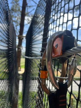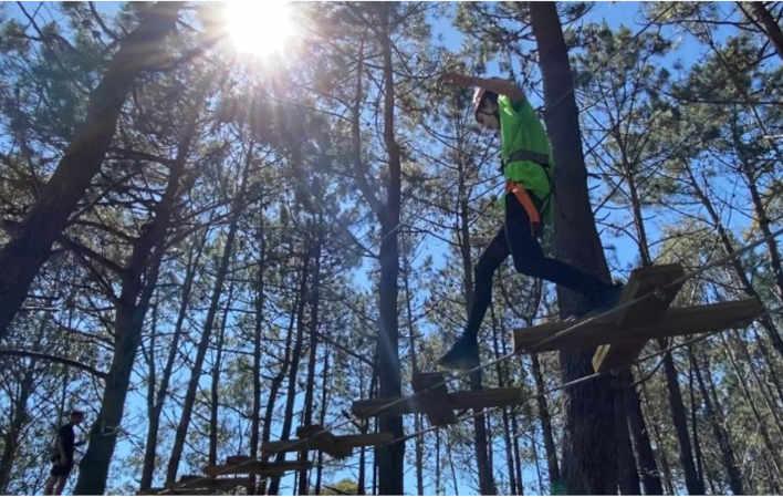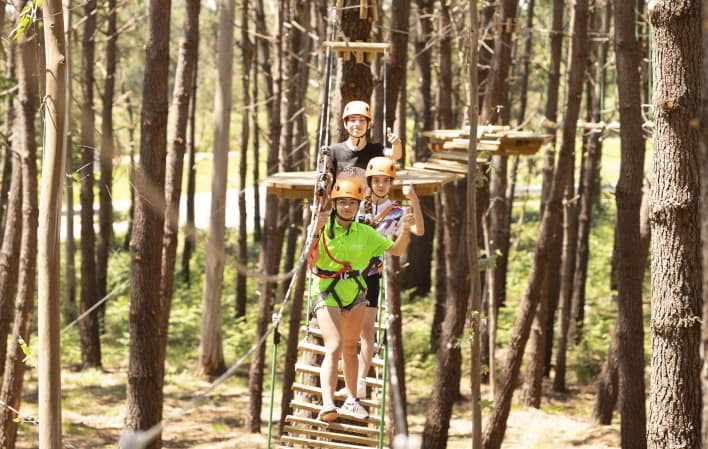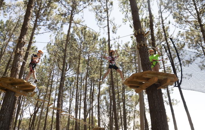 Cross suspension bridges, fly along a 120-metre-long zip line and climb up to 15 metres high through pine forests.