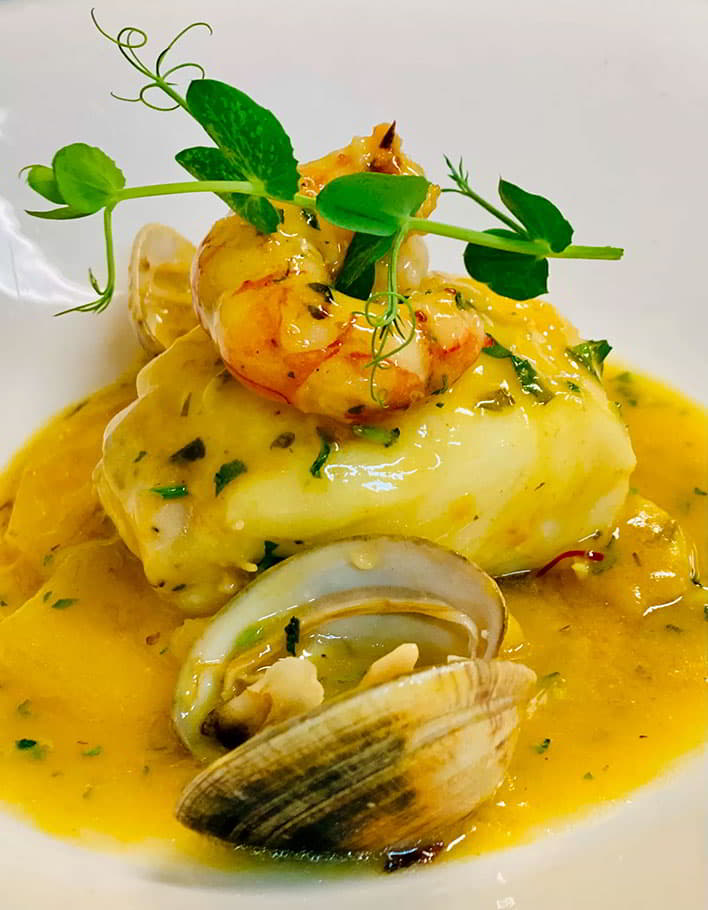 - Callos de bacalao con trompetas negras y gambas al ajillo.