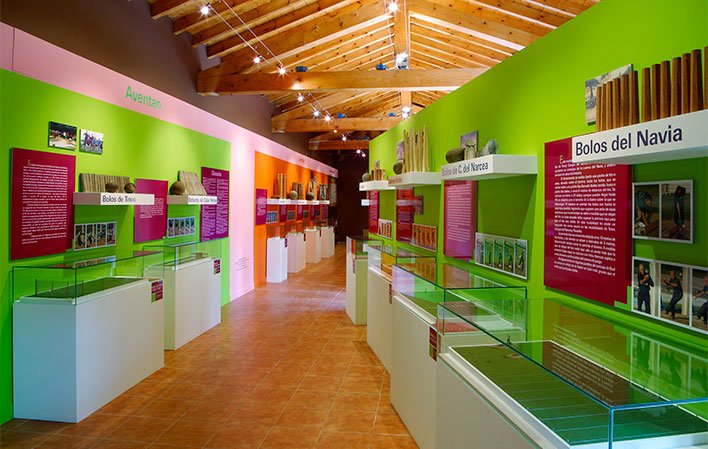 The upper floor shows the fourteen types of skittles played in Asturias, divided into two main groups: "derribo" and "aventado", which refer to the way in which the skittles are hit, either to knock them down or to throw them a distance with the impact of the ball.
