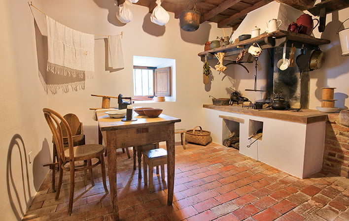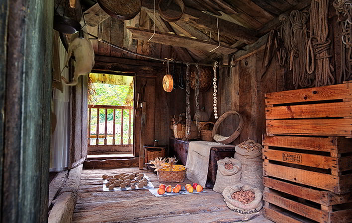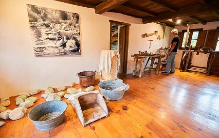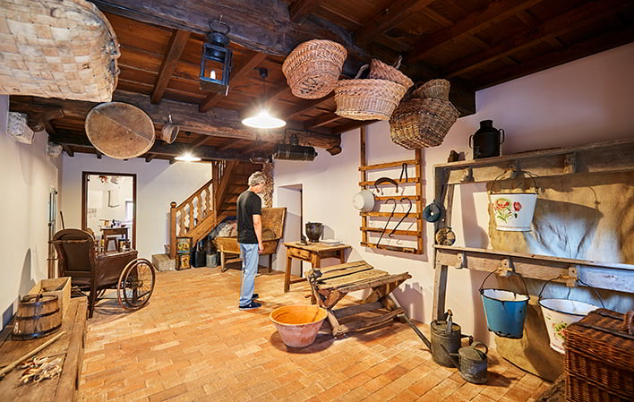 The houses that make up the Museum are arranged in two parallel rows connected by an overhanging wooden corridor. Inside you can visit the rooms of a traditional peasant house: vestibule or hall, kitchen, living room, bedroom, stable and cider press, and a series of themed exhibitions dedicated to the production of cheese and butter, the manual manufacture of tiles and bricks, textile processes, traditional folk clothing, carpenter's workshop, wood cutting tools, washerwomen, tools, a collection of enamelled metal pieces.