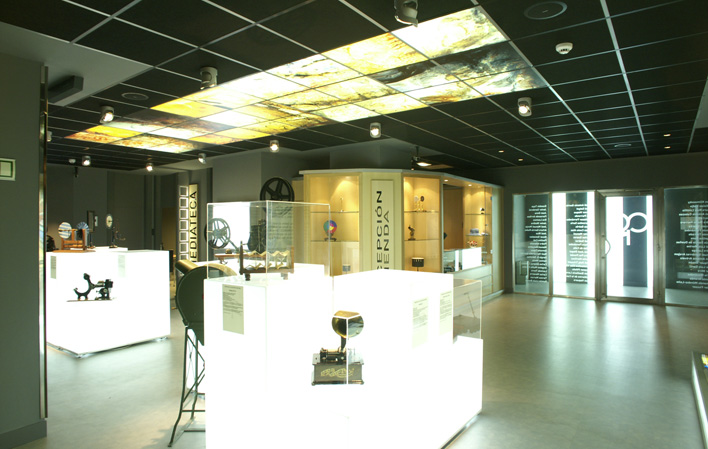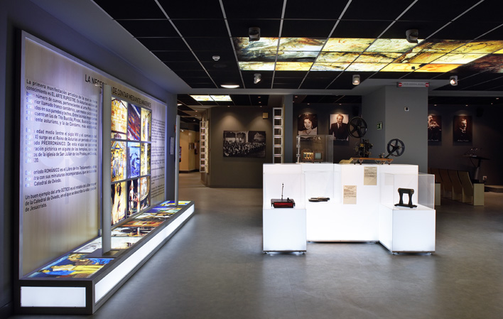 There is also a space for temporary exhibitions and a media library made up of the didactic area (encyclopaedia of Spanish cinematography and two associated databases), the cinema area (individual viewing service), the sound area (three hundred pieces of music from soundtracks related to the seventh art and television), the logistics area (guide to companies in the audiovisual sector in Asturias), the Internet area and the library.