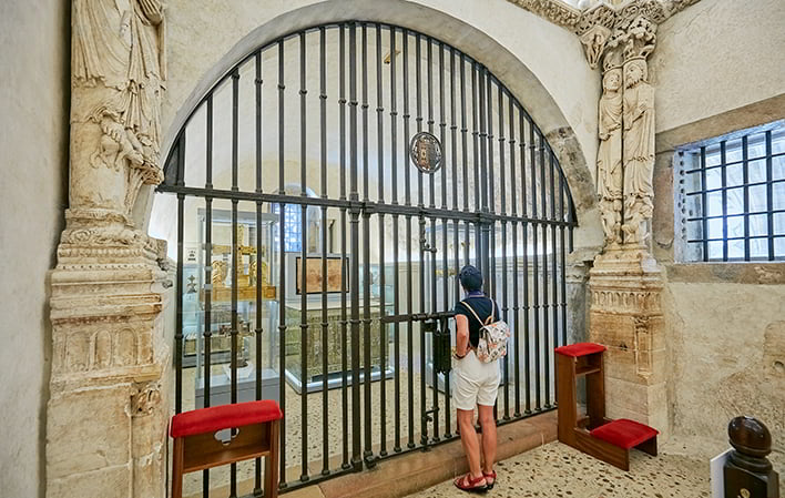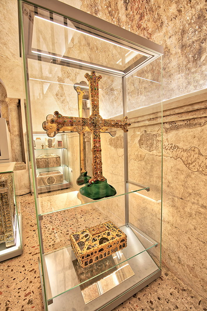 Its role is central to the Christian tradition, preserving untold treasures since the early Middle Ages: relics of the Roman crucifixions and Christ's own sweat, jewellery from ancient empires, vestiges of the crusades, all-powerful crosses from battles and reconquests...