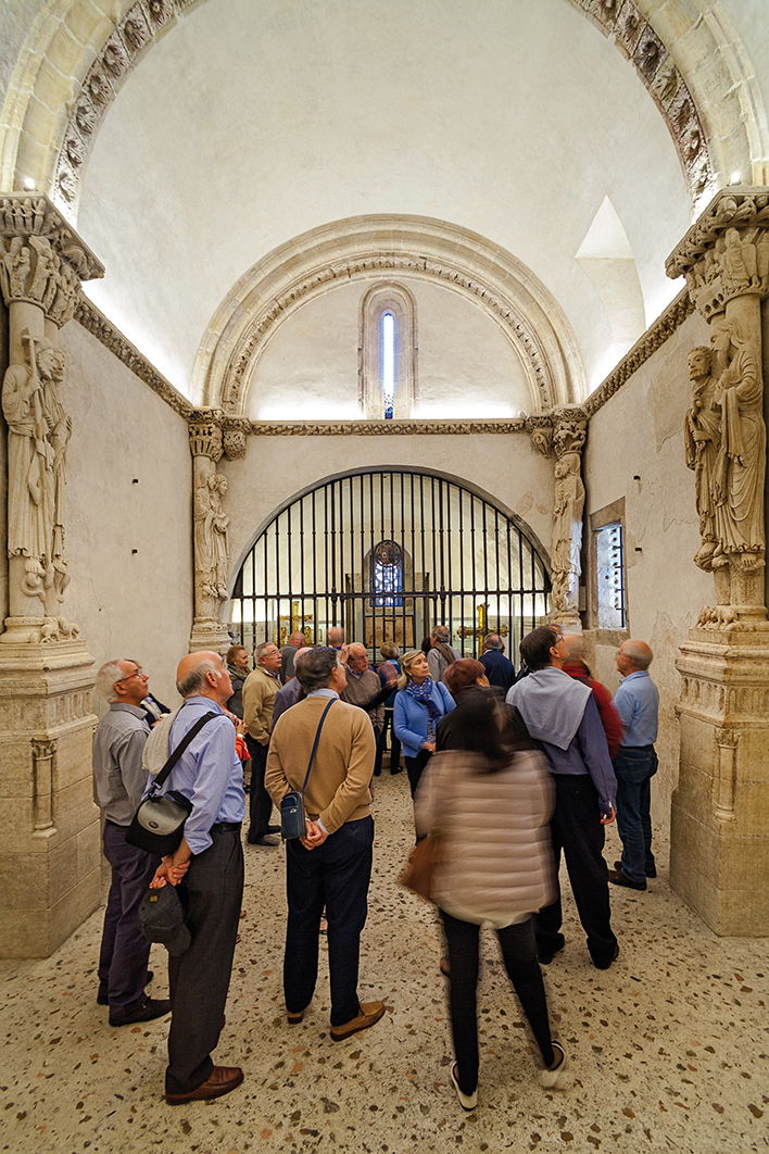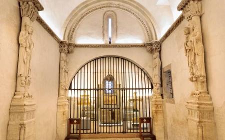 According to the latest archaeological studies, it was built during the reign of Alfonso III (866-910) to be an episcopal chapel and the tomb of martyrs. Soon after, it was also entrusted with the mission of protecting the relics. Its design, two superimposed naves, came from the Roman world. On the lower floor: the narrow crypt of the martyr Saint Leocadia, with a presbytery and altar at the back, and three tombs with well-carved tombstones. Above: the chapel of St Michael, where the relics are kept. This is a larger space, covered with a barrel vault and reinforced by large arches supported by the figures of the apostles (the apostolate of the Holy Chamber is considered one of the greatest works of this period).