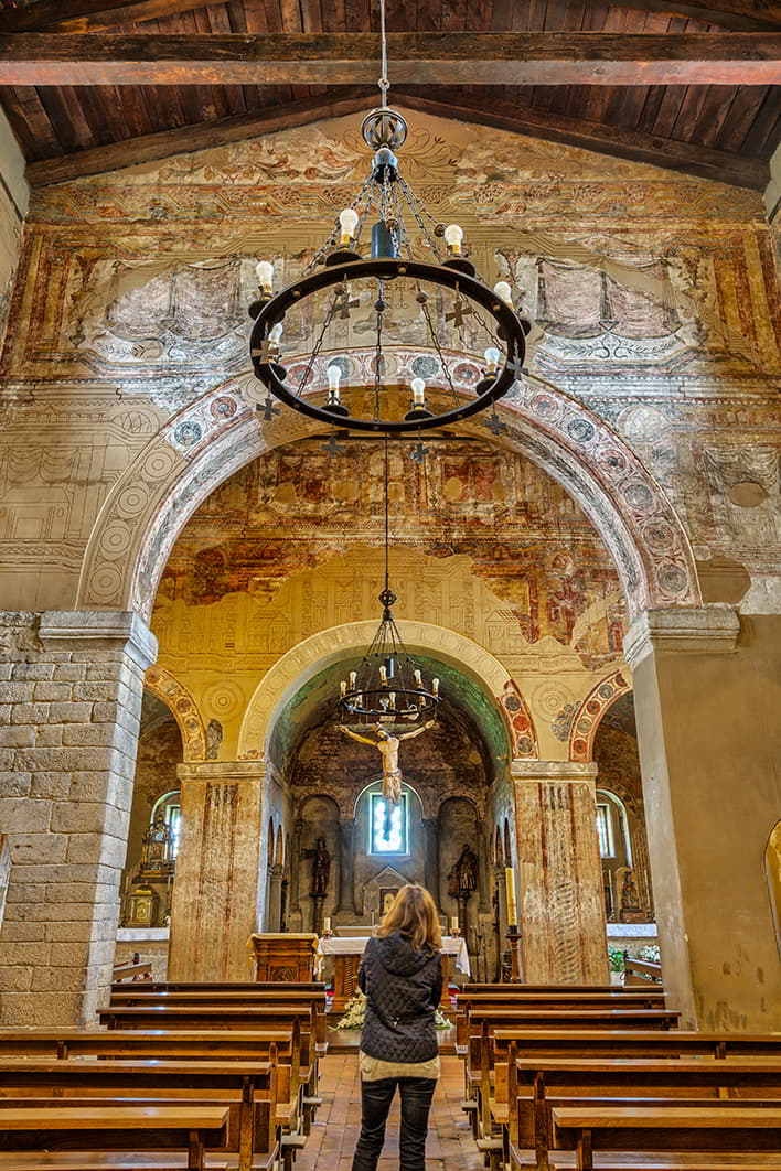 The large polychrome frescoes, friezes of interlinked and repeated geometric forms, with an abundance of plant and architectural figures, are one of the most important early medieval pictorial ensembles surviving in Europe. They represent an idealised, spiritual vision of the cosmos. In their development, strings impregnated with pigments were used to mark the lines, compasses to trace circles and symmetrical axes, always seeking the illusion of three-dimensionality.