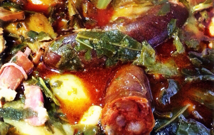 After cooking the faba beans with the pork and bacon for an hour, add the potatoes, vegetables, chorizo and black pudding. Leave to cook for a further two hours on a low heat.
