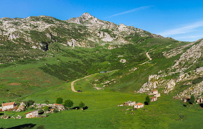 Once we reach the pass of Sierra Buena, flanked on the left by Cabeza La Xatera (1,503 m) and on the right by Cabeza Cayarga (1,528 m), it is a privileged viewpoint from which to admire the numerous peaks of Los Llerosos. A softer landscape appears before our eyes, where the limestone stone stands out against the greenery of the meadows and meadows, and in the background, the Cuera mountain range, the gateway to the Cantabrian Sea. We descend along the narrow path in search of the wide meadows of the Arnaedo sheepfold, passing by a watering place at the bottom of the sheepfold, at the foot of the slope.