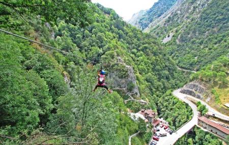 This park has seven via ferratas, two of low level, two of medium level, two of high level and one of very high level, which end in the abandoned village of Rubiellos. Of the seven zip lines, some are almost half a kilometre long and at great height. The Tibetan bridges are all different, of boards, trunks, intertwined cables, three cables ... and the "Puente de las Nubes" (Bridge of the Clouds) located 350 m. high over the River Sella and approximately 80 m. long.
