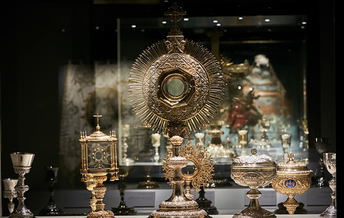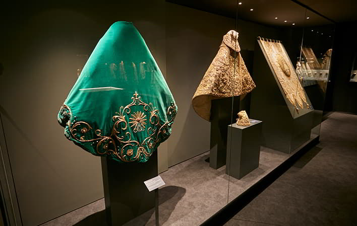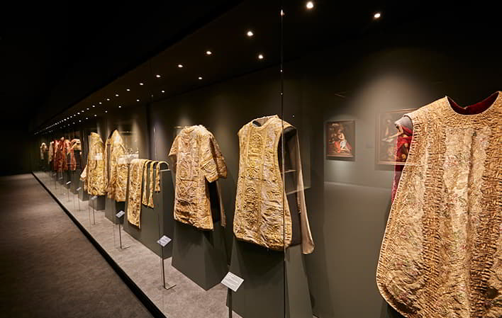 Por su parte, la primera planta cuenta con una colección de ropa litúrgica, así como cálices, custodias y mantos de la Virgen. Este espacio se completa con pintura religiosa y algunas vitrinas de exvotos, tanto de particulares como de instituciones.
