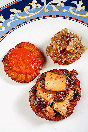 La brochette peut être décorée de quelques gouttes de confit de tomates naturel sur une tortue de maïs.