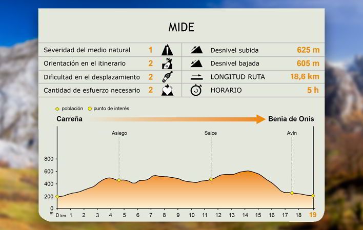 Lasciata Avín, si prosegue lungo la strada AS-114 verso Benia, capoluogo del comune di Onís, dove termina l'itinerario. Il cartello di fine tappa si trova all'uscita di Benia, accanto alla strada.