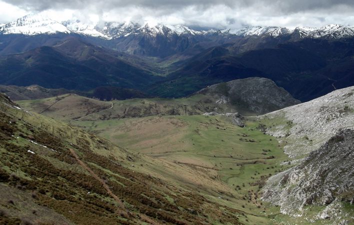 Il percorso prosegue in moderata salita lungo la pista, a tratti in forte pendenza, tra prati e zone di brughiera fino a raggiungere Sabatin, dove si svolta a sinistra e ci si dirige in piano verso Cantu Les Quintes. Da qui si svolta a sinistra e si percorre un sentiero che ci porta nei pressi dell'Ermita del Alba, dove la discesa su pista asfaltata tra prati e capanne di pietra aumenta, lasciando il Pico Cuervo sulla destra, fino a raggiungere il villaggio rurale di Las Val.linas.