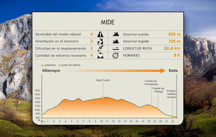 L'itinerario inizia nel centro rurale di Villamayor, salendo lungo un sentiero, tra prati e piccoli boschetti di alberi frondosi, fino all'Alto de El Cumalón, dove, seguendo la segnaletica direzionale, si imbocca un sentiero sulla sinistra. I primi metri di questa pista sono in cemento, ma ben presto si ritorna a una pista di ghiaia.